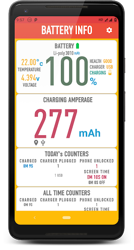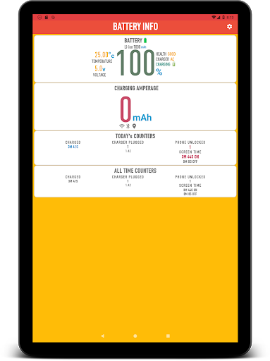 Battery information Battery Charging Level Battery Health Ampere Meter Battery Saver Voltage Temperature Battery Technology Plug Type Battery status Battery Usage Remaining level of charging in Battery Charging Notification Discharging Notification System Notification Phone Unlocked in a day Screen Time On /OFF