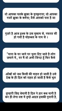 sayri is way to convey your feelings.this app contains huge collection of sayri in hindi language ,with help of you can share your feelings to your beloveds.in this app sayris are categorized in different categories like bewafa,broken heart,sad,birthday,ishq,other sayri etc.app is totally offline that means users can use app without internet connection.database of app is updated periodically so that user can have fresh stock of sayri in the market.hop you like it.