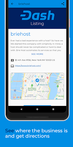 The Discover Dash app gives you access to the Dash business directory, which is a worldwide directory of business & services that accept the Dash cryptocurrency for payment. It gives Dash consumers the entire directory to shop right on their Android devices, anywhere in the world. The free-to-advertise-on directory allows advertisers to increase their market outreach and advertise their services to the mobile-connected International Dash community. It's completely free!