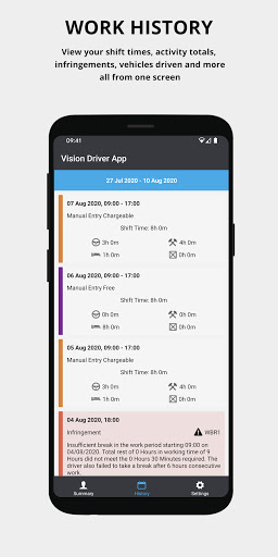 Your shift times, activity totals, vehicles driven and infringements incurred, as well displaying the source of the information such as driver card, tachograph chart or activities added to Vision for example holidays or sickness.