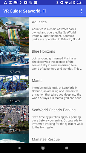 The MotorCo VR Guide to SeaWorld application is an extensive location based guide to the attractions in the amusement park located in Orlando, Florida.