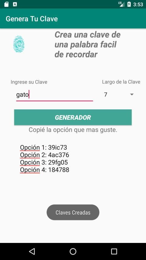 Con esta aplicación podrás generar claves de una palabra sencilla de recordar a un solo clic, por ejemplo escribes gato y te entregara tu clave modificada donde te mostraremos 4 posibles opciones donde tu elegirás la que mas gustes.
