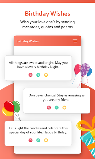 Send Special Happy Birthday Wishes to your beloved ones. The app is the collection of birthday gif images, happy birthday quotes, different birthday poems, best birthday sayings that are further categorized as funny birthday wishes, age specific, inspirational birthday quotes, religious & belated birthday wishes.