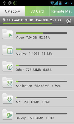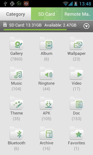 Hi Explorer manages your files quickly and intelligently by sorting your files according to their category: music, images videos, themes document, apk file, zipped filed and so on. The specially designed bluetooth folder also enables you to pick up the file you received via Bluetooth. With the buildin wifi feature allows you to get full control of your files on your PC.Features1. File sorting;2. File category management;3. Wireless file transfer