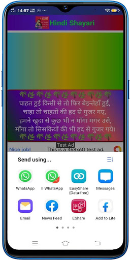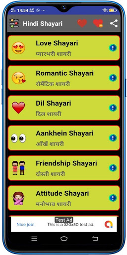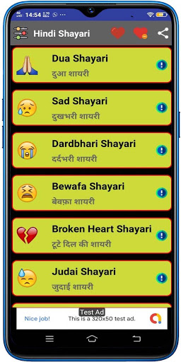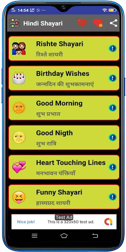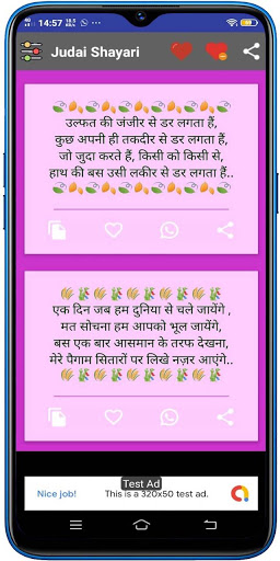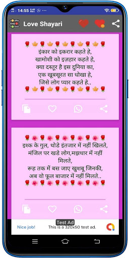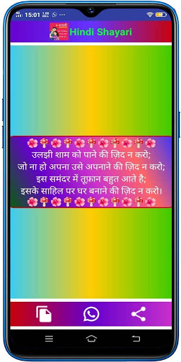 This Hindi Shayari is very easy to use, select any category, the shayaries are listed, choose the buttons for Copy shayari, Add to Favorite List, Share in Whatsapp, Share any other platform.