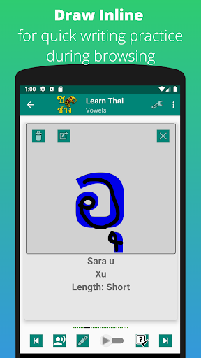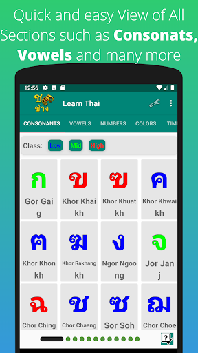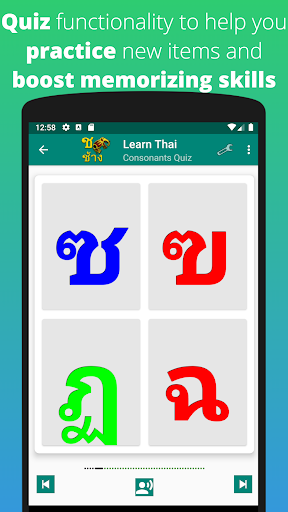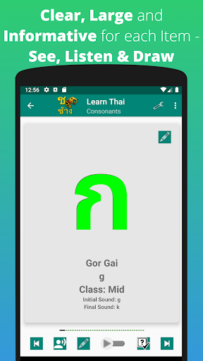 Learn Thai Alphabet App is intended to help you learn the Thai Alphabet quickly and easily using visual and Audio combined for quick learning and also Writing practice - New addition is the Quiz Mode for great practice and new Traditional and Modern Fonts to be able to understand all Thai scripts easily.