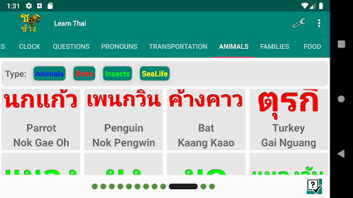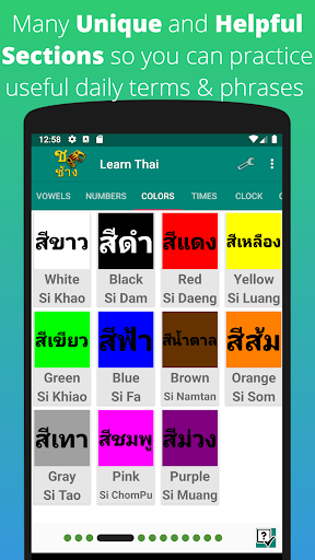 The Learn Thai Alphabet consists of 11 main parts that are accessible from the tabs at the top of the screen. These include Consonants, Vowels, Numbers, Colors, Days and Months, Clock reading, Durations, Questions, Pronouns, Animals and Family.