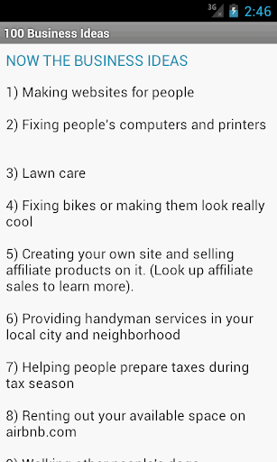 The app is split up in a few sections. The first section is about how to make money by starting any of the 100 common business ideas on the list that we have put together. The ideas there are common business ideas that most people can do.