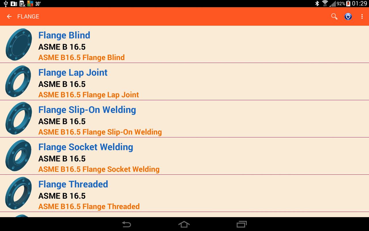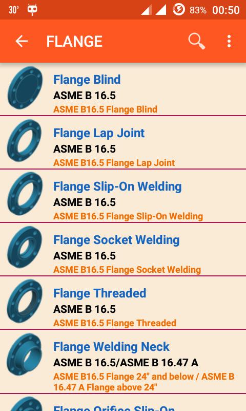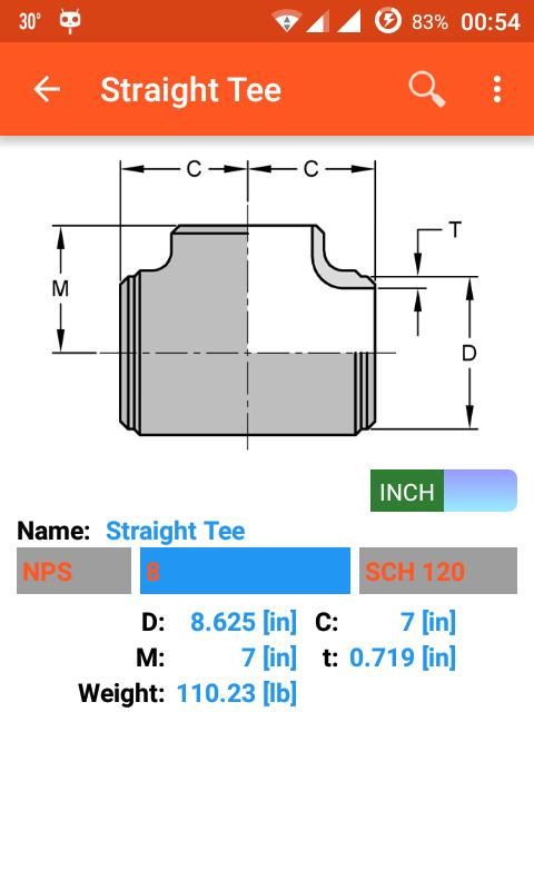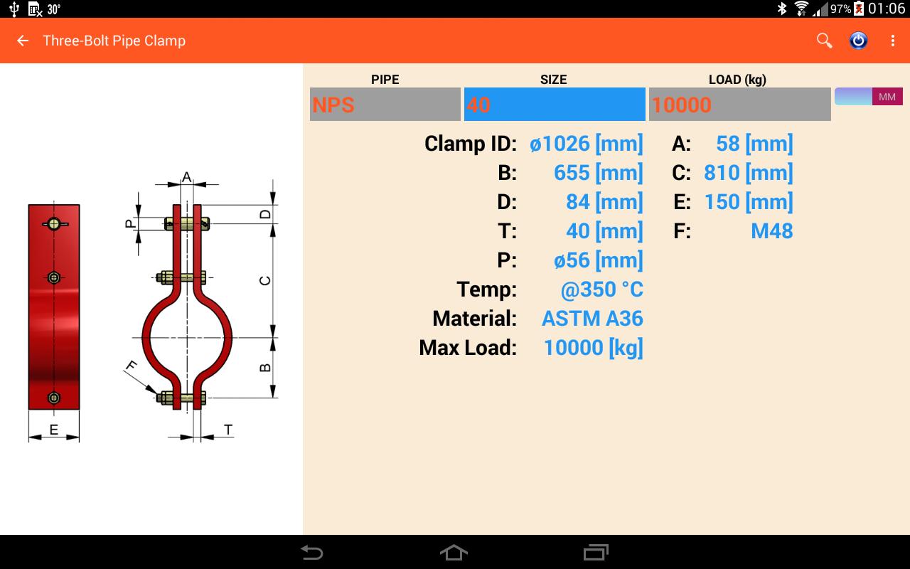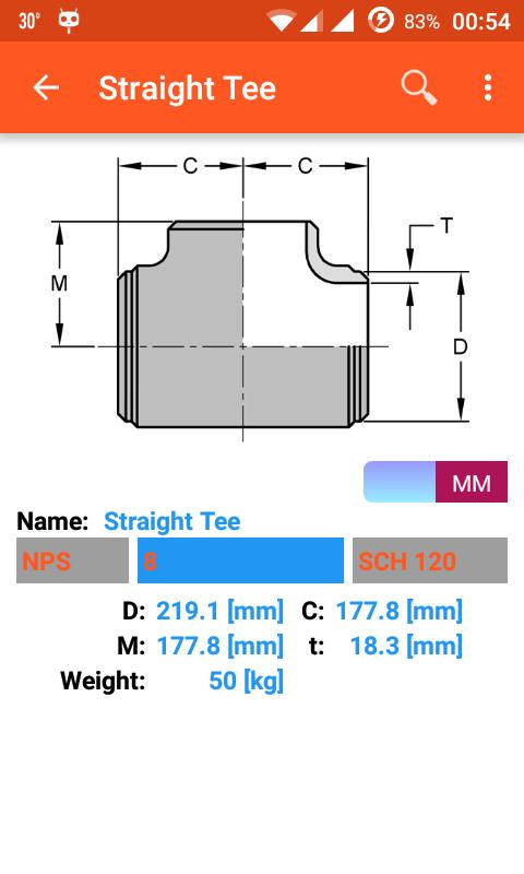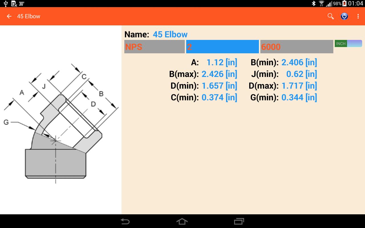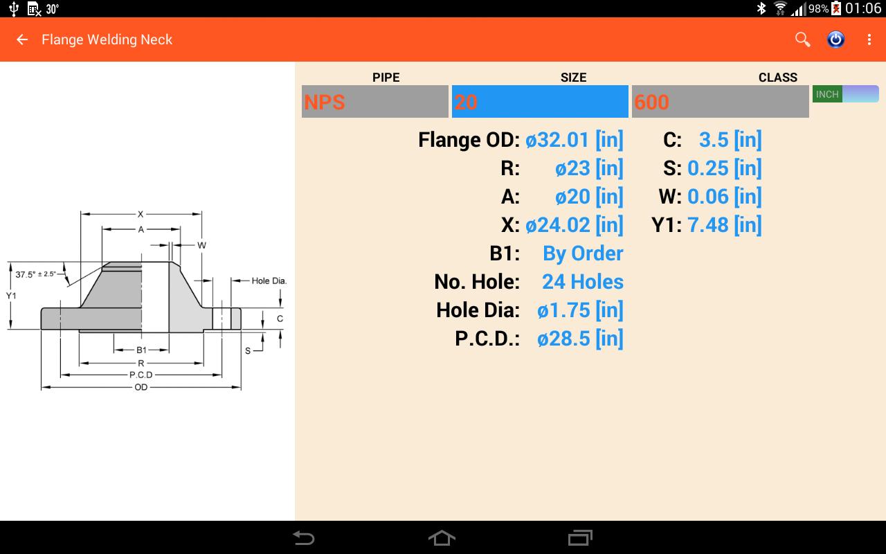 This application is dimension of piping and accessories. It has many accessories in the app such as pipe size, pipe clamp, fitting, flange and pipe hanger. This app have boths metric and us unit. It will auto change unit when user select pipe standard NPS (in) or DN (mm).