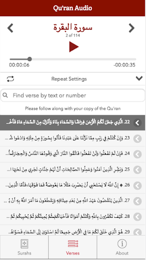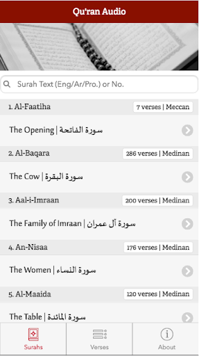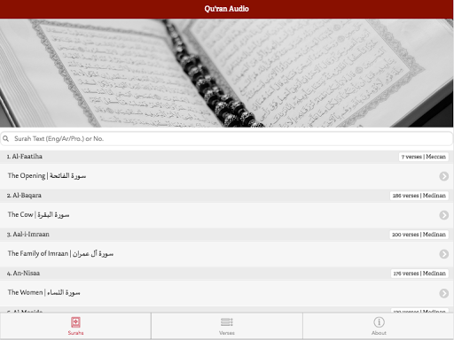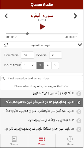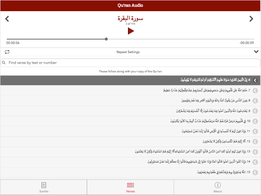 Qur'an Audio is a media audio application designed to provide an optimum experience with playing the audio recitation of any verse from the Qur'an by browsing by Surah/Chapter or searching for the text of a verse. It is designed to be used as a flipped resource when studying the Arabic pronunciation of the Qur'an (Tajwid) with a teacher. The student can set a range of verses to be repeated automatically to help with memorization and practice of the verses assigned as homework. The student then follows along with his copy of the Qur'an, rather than reading digitally, as following along from printed material is recognized to be better for recall and review. The Audio recitation is by Mohamed Siddiq El-Minshawi, recognized for his impeccable Tajwid.
