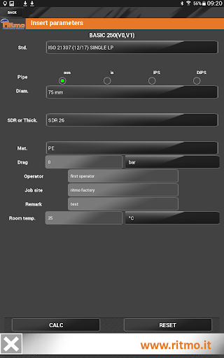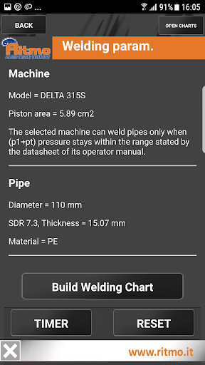 • Choice of welding machine: from list of Ritmo butt fusion hydraulic machines or free insertion of the thrust section of the cylinders (cm2, in2).