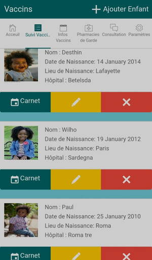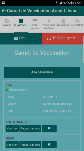 • Carnet électronique de vaccination : ne manquez plus un seul vaccin grace aux notifications de rappel, sauvegarde du carnet de vaccination de votre enfant et récupération automatique en cas de perte de celui-ci