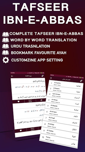 Tafseer Ibn-e-Abbas (تفسیر ابن عباس)- Complete Urdu Translation and Tafseer. The Tafseer is translated in Urdu by Hafiz M. Saeed Ahmed Atif. The app also features urdu translation of Quran by Fateh Muhammad Jalandhary.