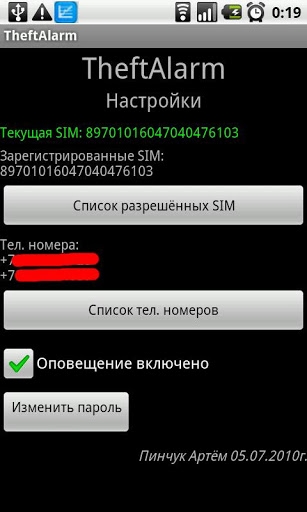 The program is designed to help you to find phone if it is stolen or lost. In the program settings you Add allowed SIM card AN phone numbers to send SMS messages. After the boot if the current IMSI is not in the list of allowed, then program send an SMS messages to configured in the settings telephone numbers.