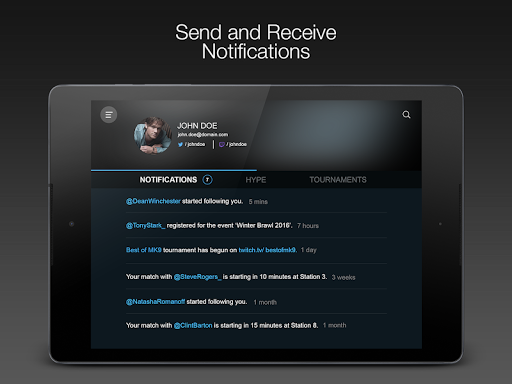 - Link Twitter, Twitch, Facebook, or Google accounts to be promoted and share any tournament results