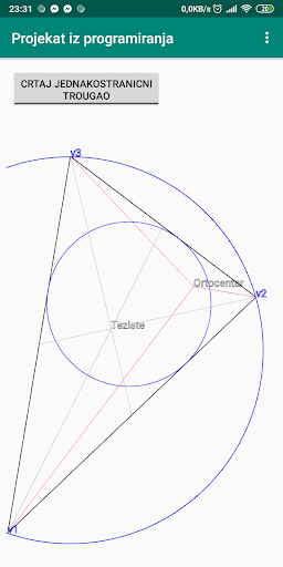 Draw simple triangles and equilateral triangles by clicking its vertices on the screen. You can add these features to the triangle: 1. Incircle 2. Excricle 3. Centroid (mass of the triangle) 4. Orthocenter