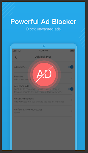 Powerful ad blocking feature that automatically filters ad content during browsing. Help users save traffic, increase battery life, and increase page load speed.