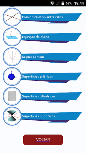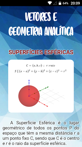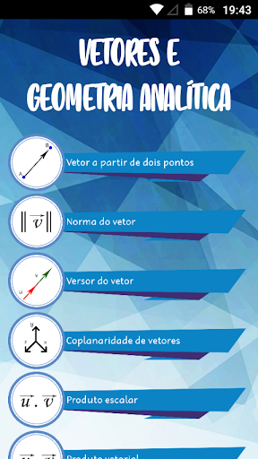 This application was developed aiming to help the learning of Analytic Geometry, in addition to being a tool for calculate a wide range of topics. The app counts on eighteen topics, including vectors, products between vectors, lines, plans, surfaces and more.