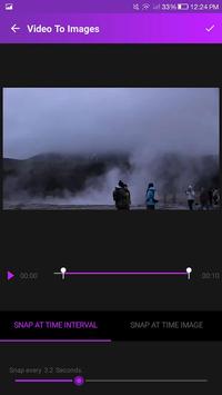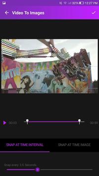 android application. This handy tool provides the best of snapping images from videos. Capture images super-fast speed and highest quality. Video to Photos app captures images or photos from your selected video for the given time duration, and save them. All photos will be accessible from your photo library. Very fast and easy to use, add your video, trim as you like and just set the values in seconds to snap images on interval just click done. Take as many photos as you want and select those you want to keep after.