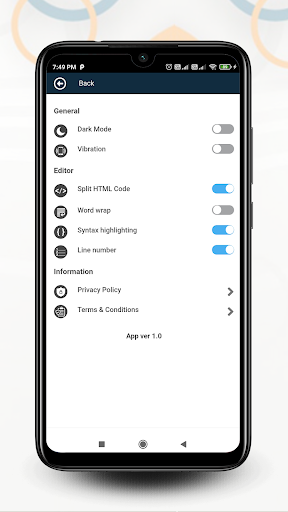 This Free HTML editor application also has an exclusive Dark Mode section. This system will be very useful for the users. Next up is the vibrate option. When you touch the screen, everything is Vibrate on the screen. One of the best features given in this application is the Split HTML Code. The purpose is to combine the sections that appear separately in the three windows and display them on the same screen. This utility is a new system not found in any other application. We also incorporated the best features like Word Wrap, Syntax Highlighting, and Line Number into this app.