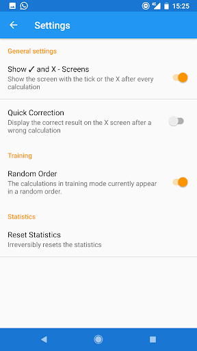 This slim app in material design helps at learning the multiplication tables from two to ten. There are two modes currently available. The first one is training mode, allowing you to select one specific times table to practice. In the second mode, test mode, you can choose multiple multiplication tables you want to be tested in. Afterwards, you can view your score and the miscalculations along with their corrections. The statistics screen presents detailed information about every single calculation. Simply have look at how often a calculation was solved correctly or wrongly or just get a quick overview thanks to the colour system representing the progress for each calculation.