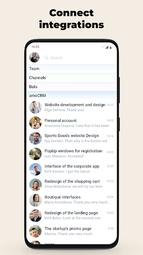 amo | team messenger allows you to communicate with all of your colleagues instantly. You can invite team members to your account, message them directly and also collaborate in group chats. You can even connect integrations such as Trello or amoCRM, communicating using lead cards or discussing current tasks without leaving the messenger.