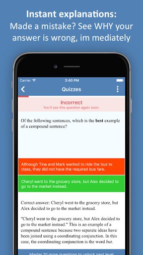 - Detailed explanations: When you make a mistake, the app tells you right away if your answer is wrong and why. You understand and remember every wrong answer.