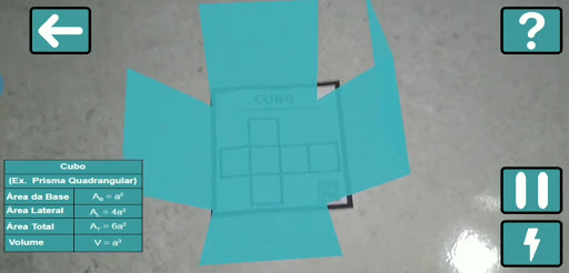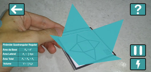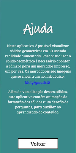 Ta aplikacja ma cel, aby służyć jako pomoc w nauczaniu geometrii przestrzennej, takich jak: pryzmaty, piramidy, cylinder, stożek, sfera. Oprócz pokazywania stałego w 3D pokazuje animację formacji solidnej z planowania lub rewolucji. Wykorzystuje znudzoną rzeczywistość na podstawie zakładek, zdjęcia zakładek można pobrać za pomocą linku w menu Pomoc w aplikacji. Aby wyświetlić geometryczne substancje stałe, konieczne jest wskazanie aparatu aplikacji do zdjęć markerów.