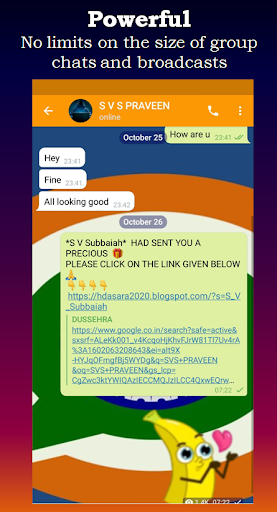UNLIMITED: You can send media and files, without any limits on their type and size. Your entire chat history will require no disk space on your device, and will be securely stored in the Indian Messenger cloud for as long as you need it.