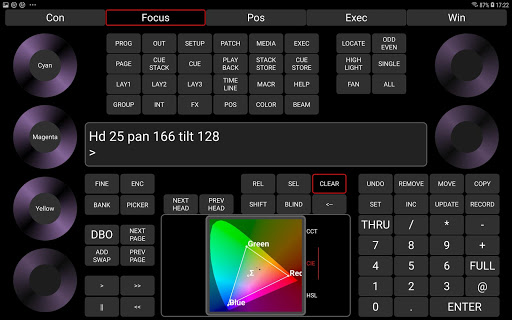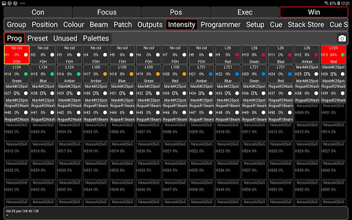 MagicQ Remote supports focusing with pan and tilt controls, colour adjustment using the rainbow colour picker and rig testing through the unique MagicQ Execute Window. Palettes, Groups and Cues can be edited and updated.