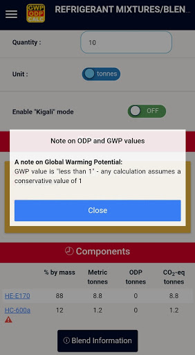 For refrigerant mixtures/blends, simply select the name of the blend and enter the quantity. The calculator will display the corresponding total ODP tonnes and CO2- equivalent tonnes for that quantity of substance. The components of the mixture and their relative proportions (metric, ODP, CO2- equivalent) are also displayed. Both these types of calculations can be carried out in both the "Actual Values" mode and the "Kigali Amendment" mode.