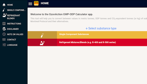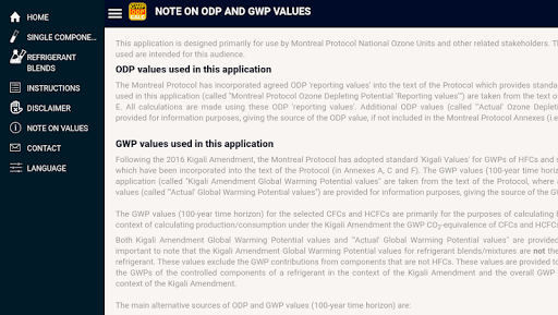 The UNEP OzonAction GWP-ODP Calculator app will help you to convert between values in metric tonnes, ODP tonnes and CO2-equivalent tonnes (or kg) of substances controlled by the Montreal Protocol and their alternatives. The updated application now includes a new Kigali Amendment mode. The app can now be used in two different modes: the regular "Actual Values" mode and the "Kigali Amendment" mode. In the Kigali Amendment mode, the global warming potential (GWP) values provided are those specified in the Kigali Amendment to the Montreal Protocol, i.e. GWP values are only assigned to controlled HFCs. In this mode the GWP values used to calculate the refrigerant blends/mixtures only include GWP contributions from components that are controlled HFCs. The user can effortlessly switch between modes. The OzonAction GWP-ODP Calculator uses standard ODP values and GWP values as specified in the text of the Montreal Protocol to make the conversions; other ozone depleting potential and global warming potential values from the recent reports from the Montreal Protocol technology and scientific expert panels as well as the Intergovernmental Panel on Climate Change (IPCC) are used when appropriate, with references to sources of all values used. The app includes new refrigerant mixtures (with ASHRAE approved refrigerant designations). The app can be viewed in English, French or Spanish.