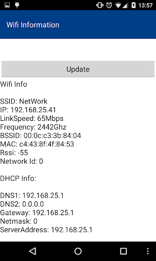 Use The Wifi Information for Have Access to the Information About your Wifi Connection: BSSID , Frequency , SSID , Speed , Mac , RSSI , Network Id, DNS and more .