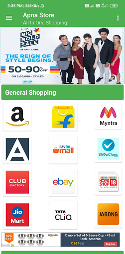 All in One Shopping Apps Flipkart Shopping, Amazon, Snapdeal shopping, Shopclues Shopping, Paytm Mall, Myntra Shopping, Jabong Shopping, Mr. Voonik Shopping, ebay Shopping, Mi Store, Tata CLiQ, naaptol, homeshop18, AliExpress, Quikr, Ajio and many more top shopping sites