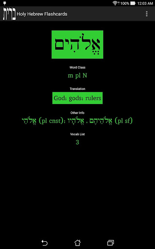 This app provides flashcards for the most frequent vocabulary of Biblical Hebrew in random order. The vocabulary is based on the textbook "Holy Hebrew" by Steven Coxhead. Each flashcard identifies the word class of the vocabulary item, its translation, other information (where relevant), and the vocabulary list in the textbook that the item is from. The app also allows users to choose specific vocab lists and word classes to drill.