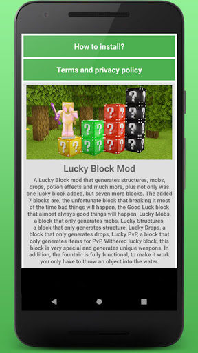 The app Lucky Block Mod For Minecraft was developed to those wanting to "increase" their luck in minecraft.