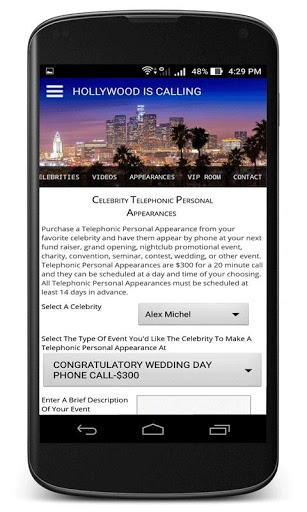 Whether it's for a special occasion or business, there's no better way to impress a client, sweetheart or a friend then to use HollywoodIsCalling.com We allow fans, business people and movie lovers to interact with their favorite actors, celebrities and athletes.
