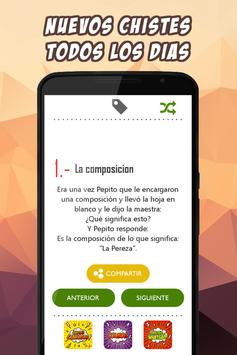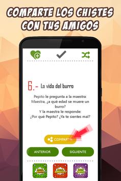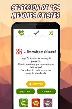 .Si encuentras alguno que te guste mucho, puedes utilizar el botón central para compartir el chiste a través de tus aplicaciones favoritas, tanto de mensajería como redes sociales, whatsapp por ejemplo. También tienes la posibilidad de mandar estos chistes buenísimos a través de SMS o email por ejemplo. En definitiva, podrás compartir los chistes a través del programa que desees.