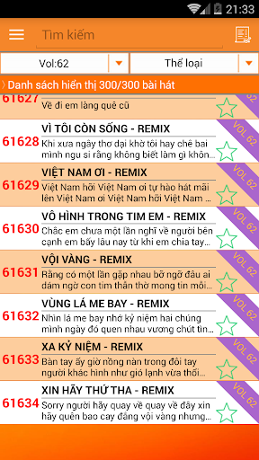- Tìm bài hát nhanh tiếng việt có dấu không dấu, tên viết tắt của bài hát, liên tục cập nhật các vol mới nhất.