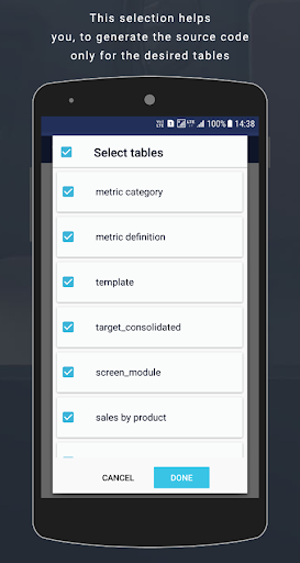 We offer a platform which facilitates the dynamically generated source code in no time with very easy/responsive GUI and the APIs such as insert, update, delete, GetList, GetData, sqlite functions, etc...