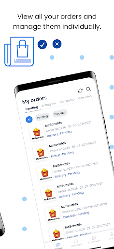 - Affiliated businesses can view order details: product name, quantity, price, payment method, delivery or pickup instructions