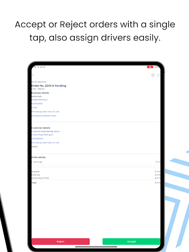 After clicking on the pending order, the tablet will display all relevant details: customer details (name, phone number, address) and delivery details (address, etc.).
