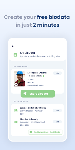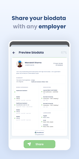 Our app lets you create your biodata for free in Hindi and we'll translate it to English, so you can share it with anyone. Instead of going through hundreds of job postings and applying, our smart matching engine will match you to jobs that are the best fit for you, increasing your chances of success. Plus, with our past employment verification, you'll be able to have proof of your experience.