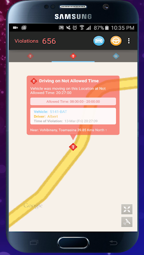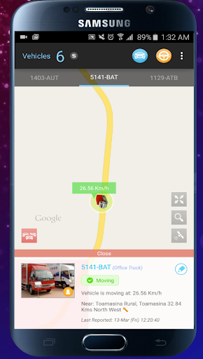 - Live Tracking of Vehicles with vehicle photo, friendly name, icon, speed, and current address.