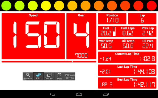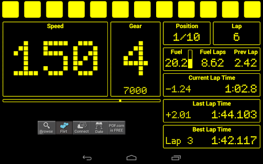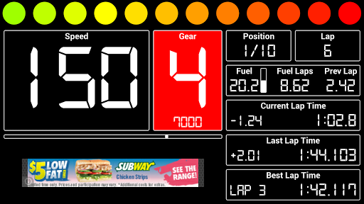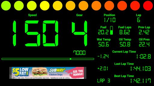 It enables your phone or tablet to display Speed, Gear, RPM, Position, Lap, Fuel, Fuel Laps Remaining, Fuel Last Lap, Water Temp, Oil Temp, Oil Pressure, Current Lap Time, Last Lap Time, Best Lap Time and Track Position.