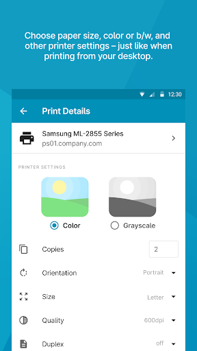 - Choose paper size, color or b/w, and other settings of the actual printer, even a remote printer, just like you would do when printing from your desktop.