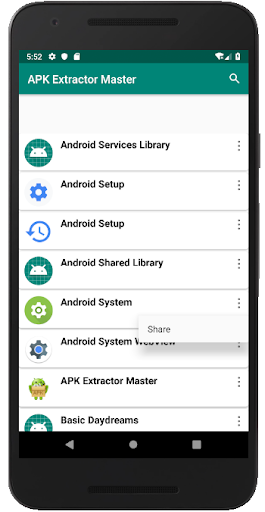 APK Extractor Master. Lists all the apps in the device. Upon clicking on any app, the apk file is saved in internal storage in the folder APKOutput. The choice of your app can be searched as well from the list of shown apps. Each app has share option too which will enable to share the apk file through mail,drive,whatsapp etc