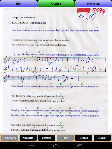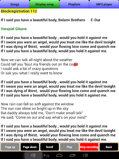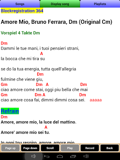 Start Scroll, Stop Scrolling, manually moving by the finger). After that you can "Play" the recorded song which all movements at the correct time.