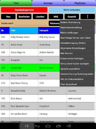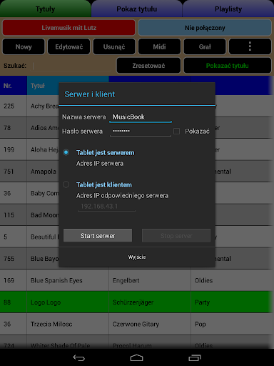 Several tablets can be connected via Wifi. One device must be the server (e.g. the bandleader). This device is used as hotspot. No router is required on stage! The other tablets will be connected to the server as clients. The server synchronizes the song number on all connected client tablets. The server also sends commands for Page down, Page up,
