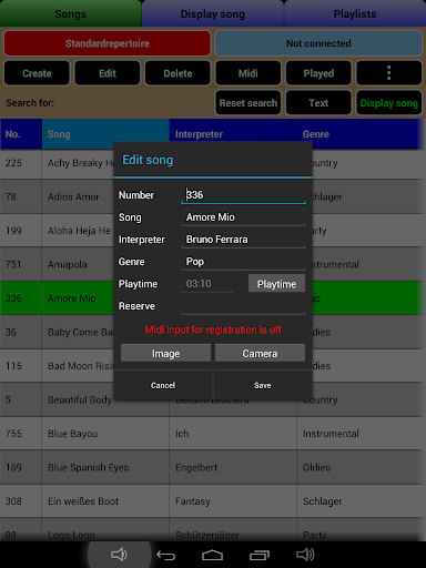 The free app MusicBook is at start time the DEMO. The restrictions are: Maximum 2 repertoires with maximum 10 songs in each repertoire.